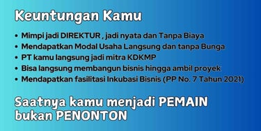 Selain sebagai Anggota KDKMP, kamu juga adalah salah satu Direktur Perusahaan yang resmi dan terdaftar sebagai mitra langsung KDKMP. Jadi, Keanggotaan KDKMP akan menjadi lebih profesional, setara dan saling menguntungkan, karena anggota KDKMP dapat menjadi mitra KDKMP melalui PT yang dimilikinya (Pemerintah telah memberikan support resminya melalui Simkopdes). Beberapa contoh kemitraan yang dapat dibangun antara KDKMP dan PT milik aggota seperti Supply Produk, KSO, Joint Venture dll.